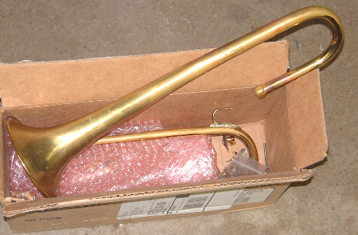 While I wait for the lacquer remover to do its thing, I gather up the old cornet parts and place them together in a box. Though I'll be using new braces, if needed, two of these cornet braces could be used to mount the leadpipe and bell to the valve cluster. You can see these two braces in the photo below, just under the finger hook of the leadpipe.