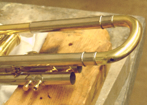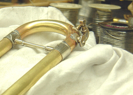With the crook and tubes in place, it's time to solder! First I will solder the crook. Next will be the brace with its two flanges. There are so many steps involved in soldering this brace that I've decided to leave out any photos of the procedure. Plus I can't give away 16 years worth of trade secrets! ;-)