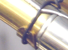 Here's a close-up look at how I have the part secured for soldering. Note the small brass shim placed under the binding wire. The purpose of this is to keep the wire from damaging the delicate brass of the leadpipe. You really wouldn't want to have the wire directly on the leadpipe as it could scratch, or even worse, dent or crimp the tubing!